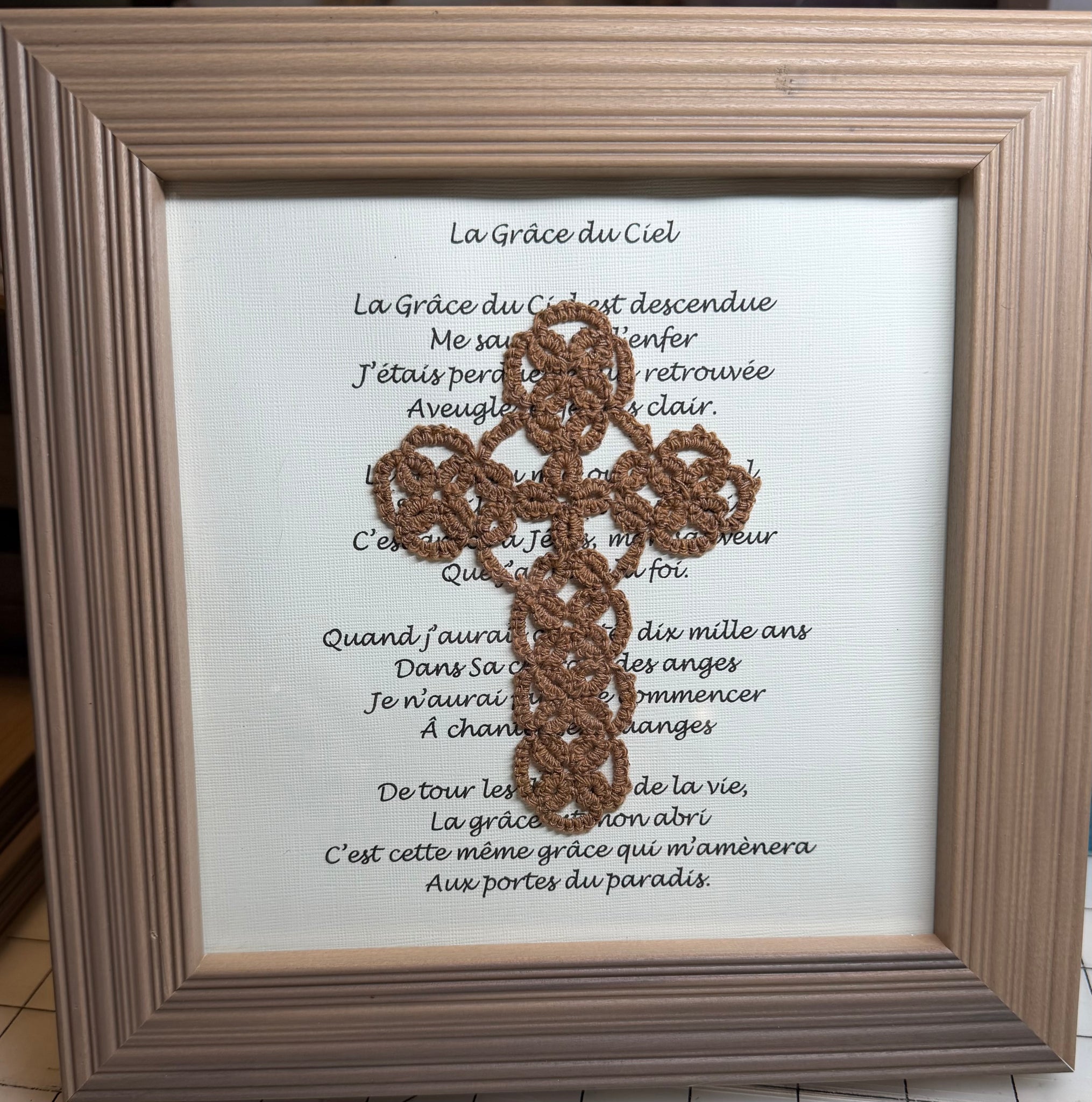 Shuttle tatted detailed cross with Acadian Brown Cotton, grown in the heart of Acadiana! La Grace du Ciel (Amazing Grace - Cajun French)